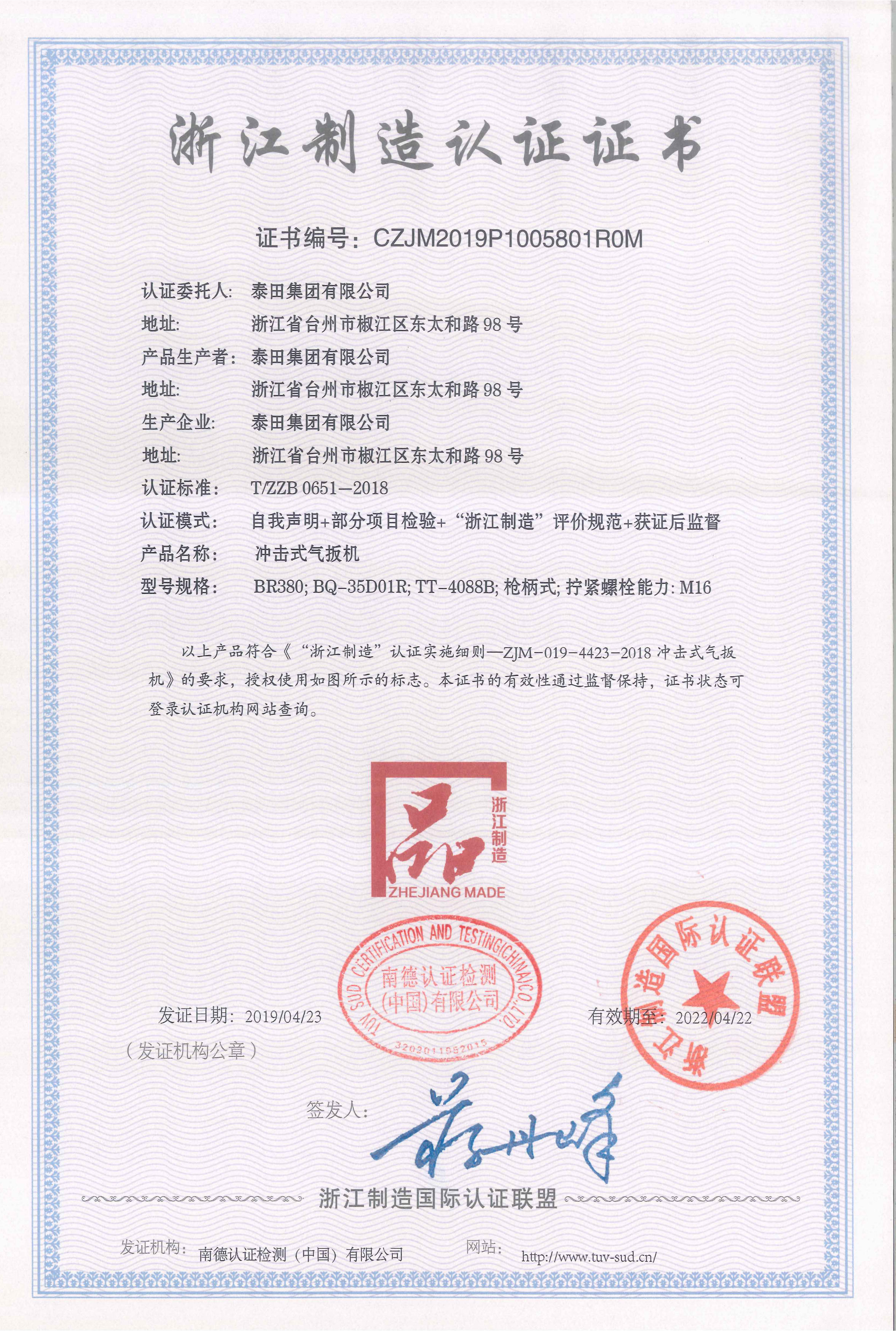 2019年被浙江認證制造國際認證聯(lián)盟認證為“浙江制造”